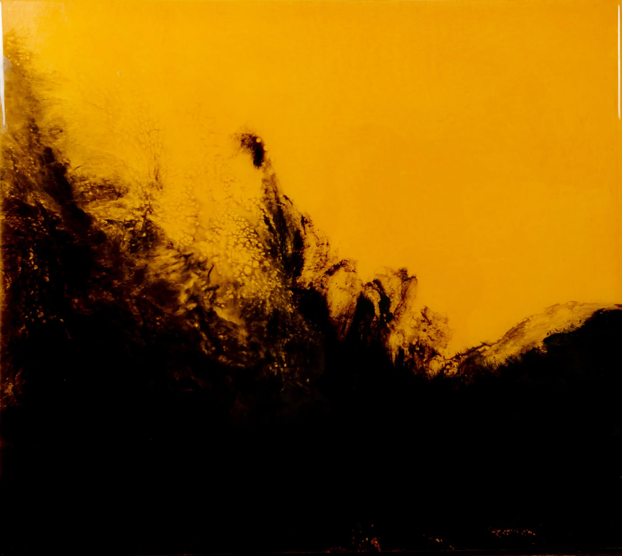 With pure organic colour and almost liquid resin finish, Jon tackles this head-on. The works are loosely based on landscape painting, but are non-specific: in their imagery, they are more about exploring the idea of raw, untempered nature. There are hints of horizon lines and figurative suggestions - a painting might remind one person of the sea, another of smoke from a fire, or of the depths of a forest - but the objective is to use abstraction to tap into something more amorphous and primeval.